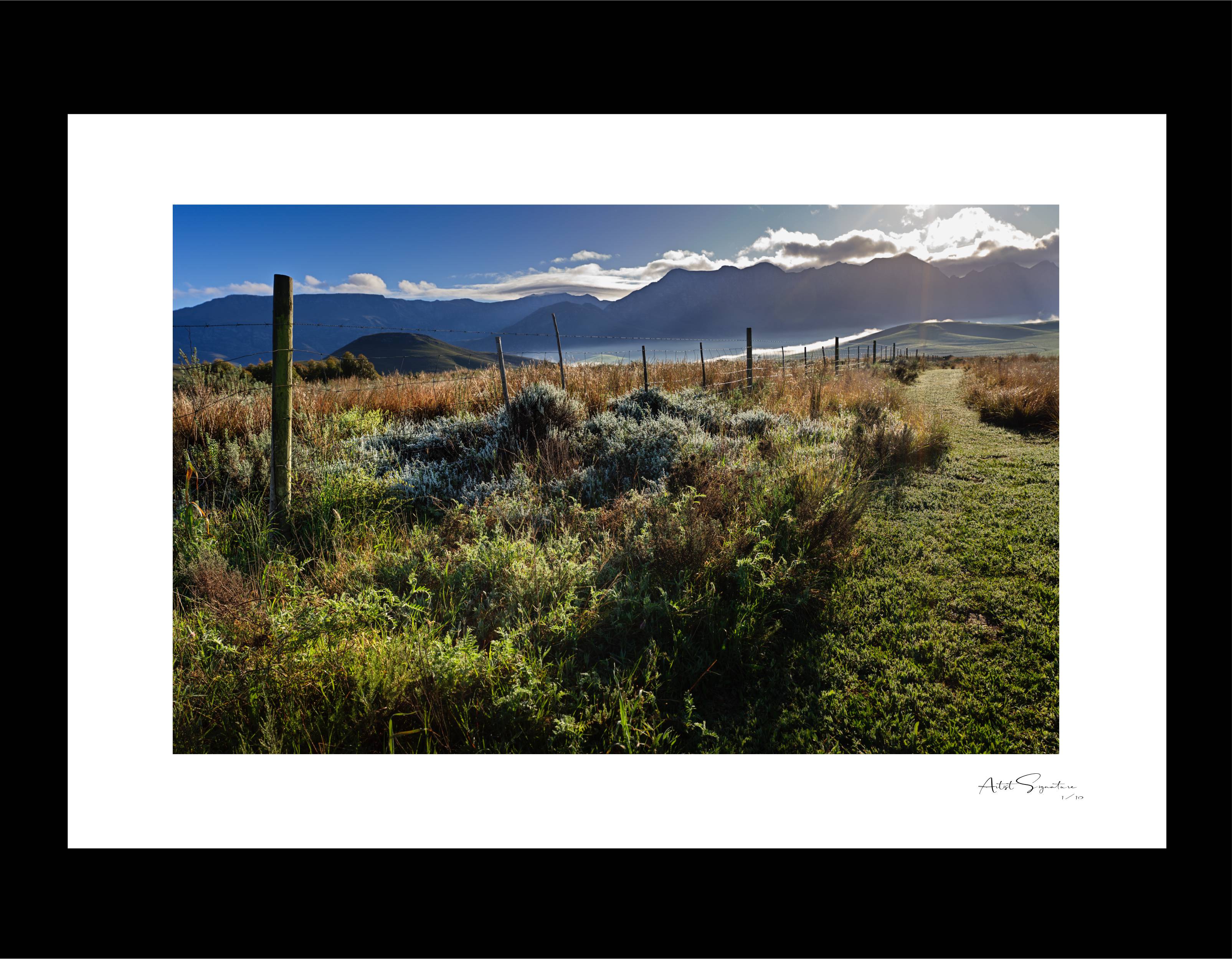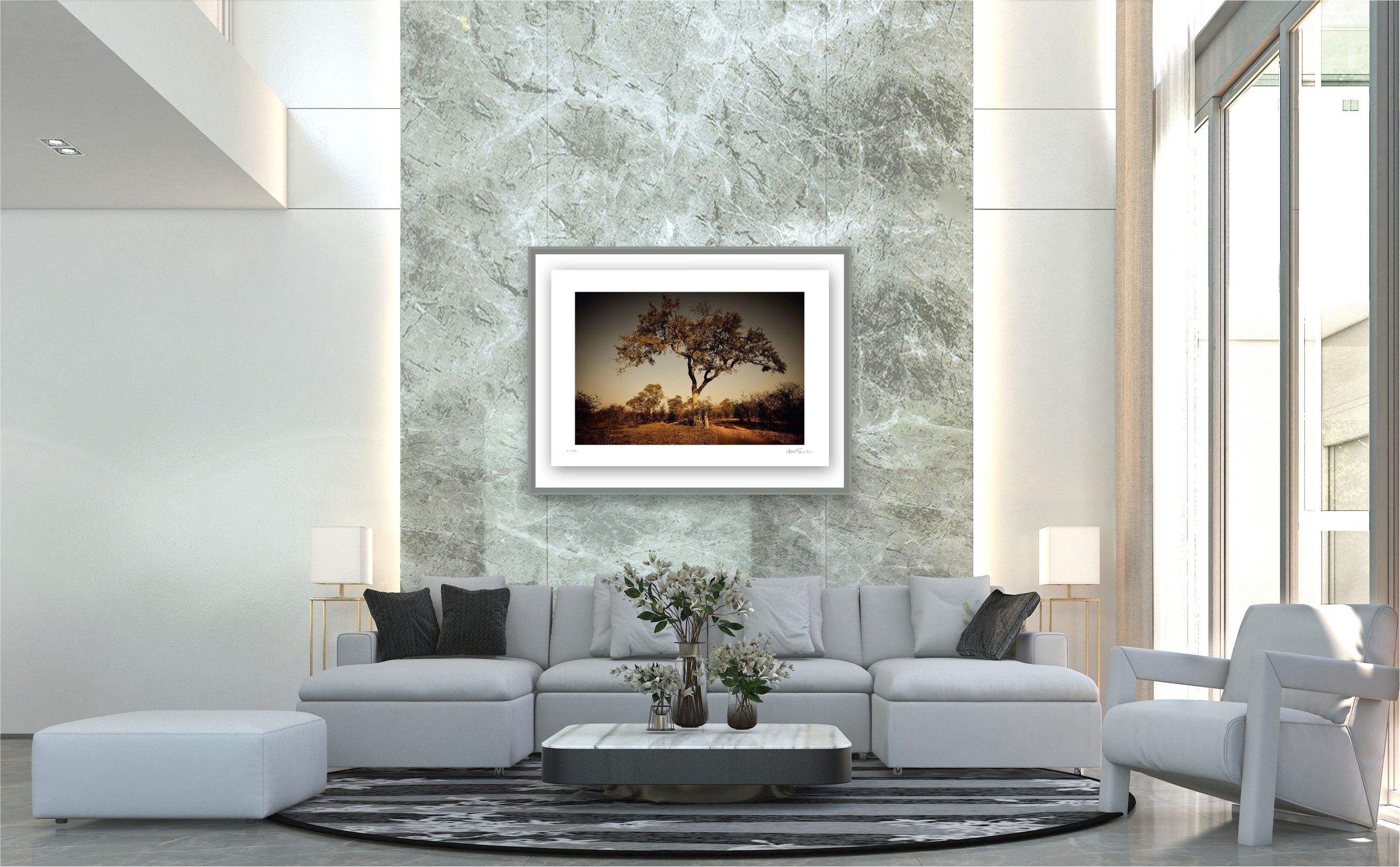 This print combines intriguingly elegant shapes, lines, and soft tones to create a surreal atmosphere of the usually hot and dry semi-arid region. To achieve his artistic objective, the artist has carefully used the orange morning light in the mist to reveal the individuality of the trees.