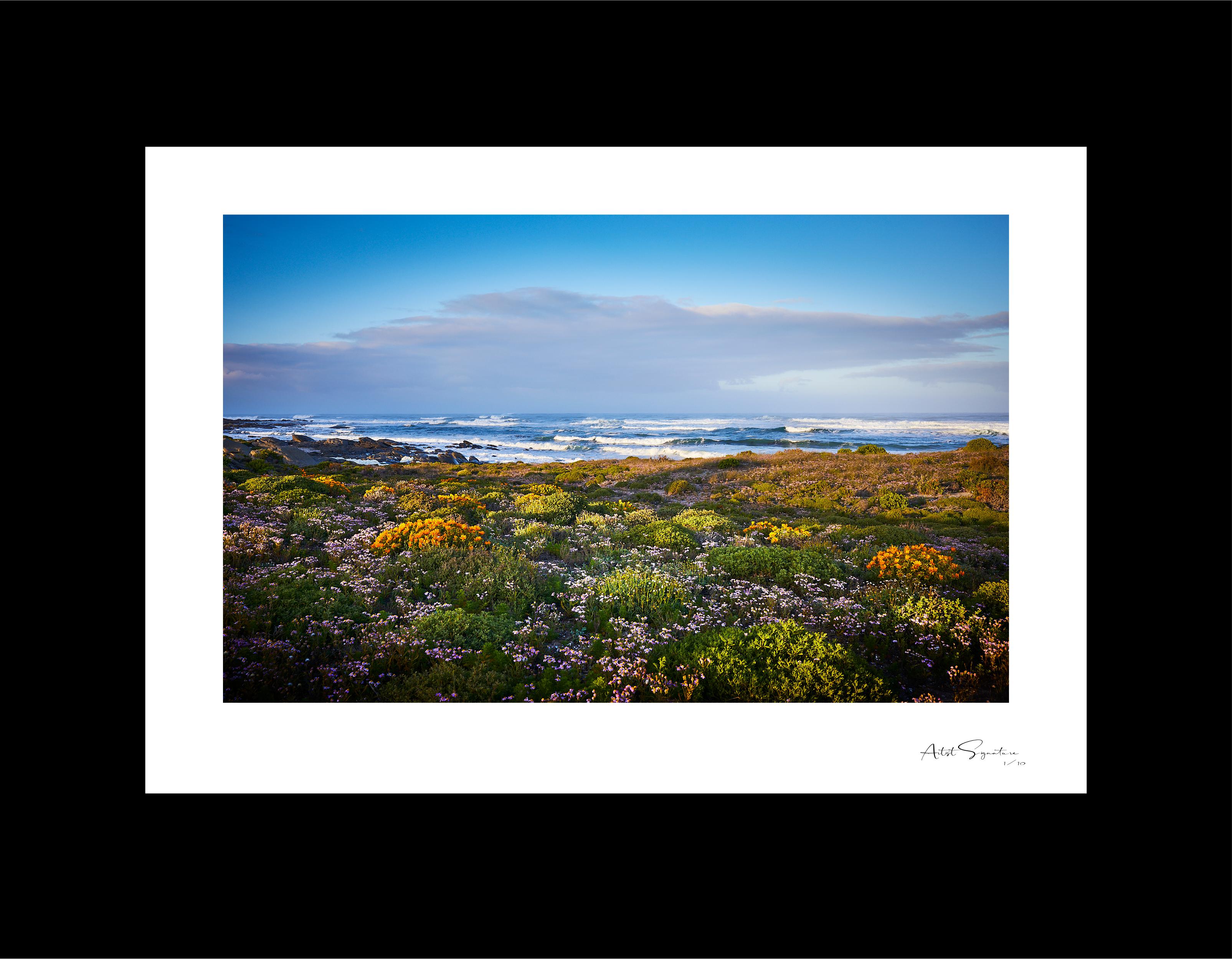 The West Coast is known for it's flower rich shores flanked by ice-cold seas. The artist captures the juxtaposition of the warm morning sun awakening a sea of flowers against the looming cold front over a restless artic like ocean.