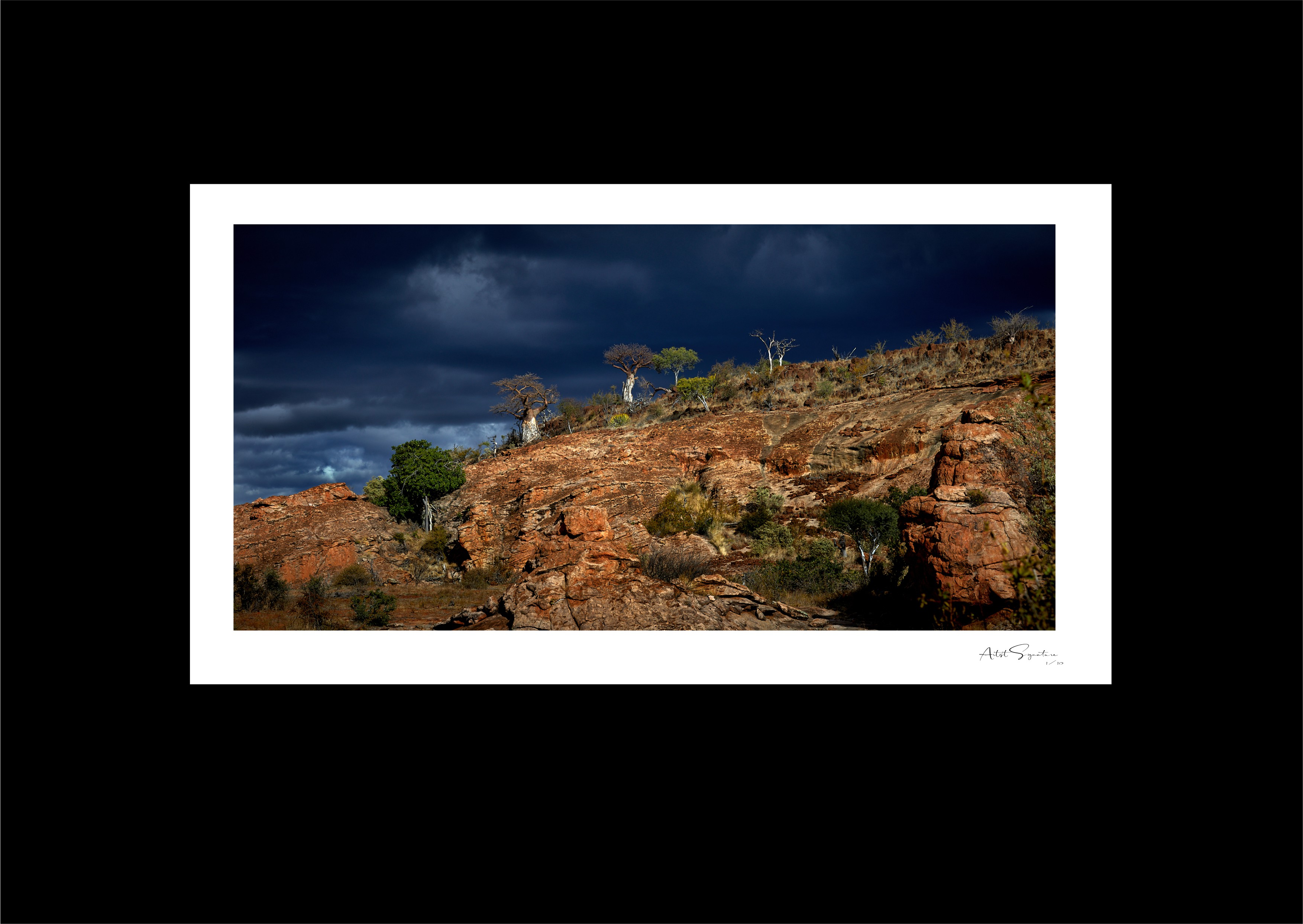 The dazzling bright sunlight after the storm highlights these Baobab trees which dominate the skyline. Their baroque beauty along the rocky ridge is simply breathtaking.