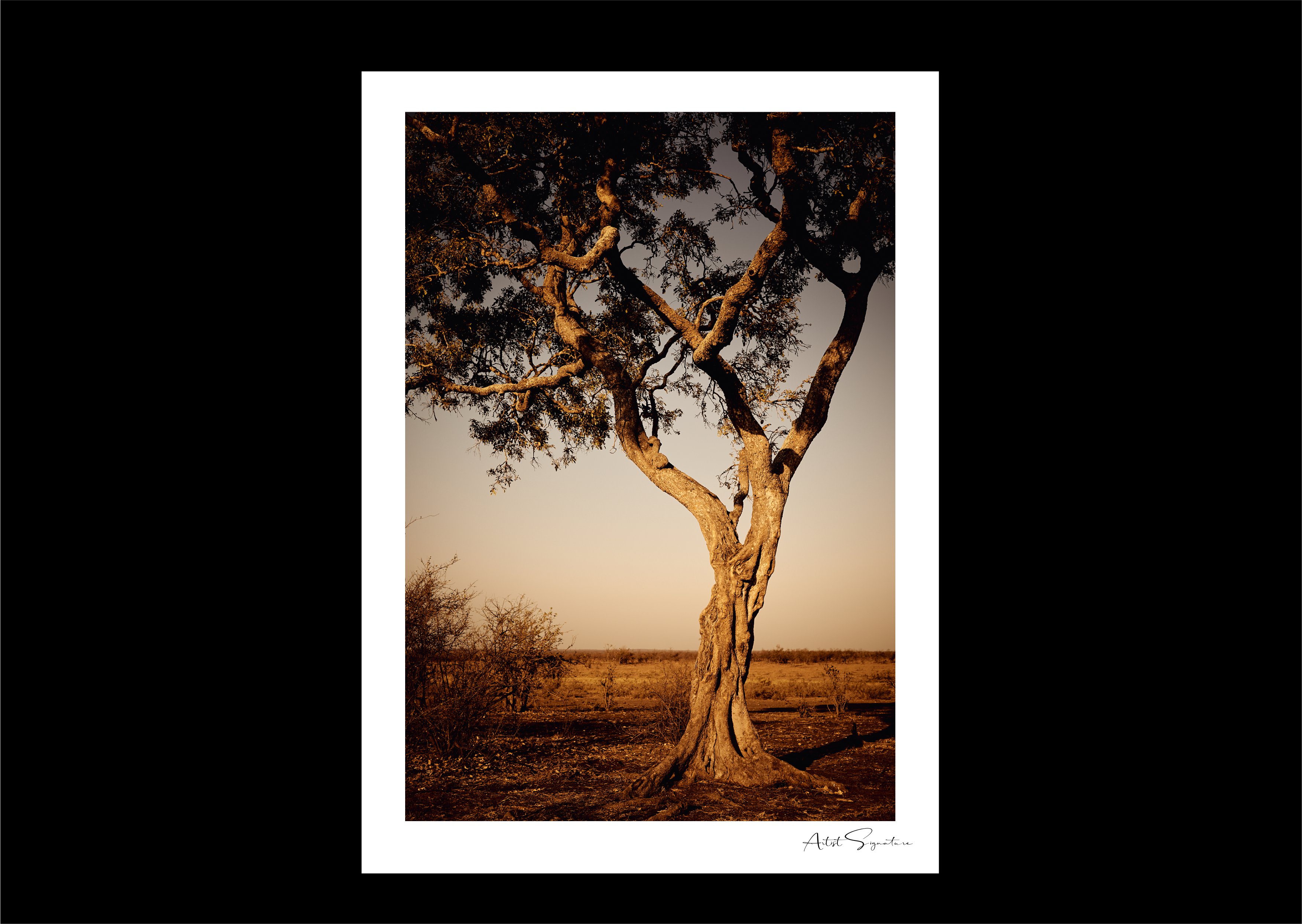 This print combines intriguingly elegant shapes, lines, and soft tones to create a surreal atmosphere of the usually hot and dry semi-arid region. To achieve his artistic objective, the artist has carefully used the orange morning light in the mist to reveal the individuality of the trees.